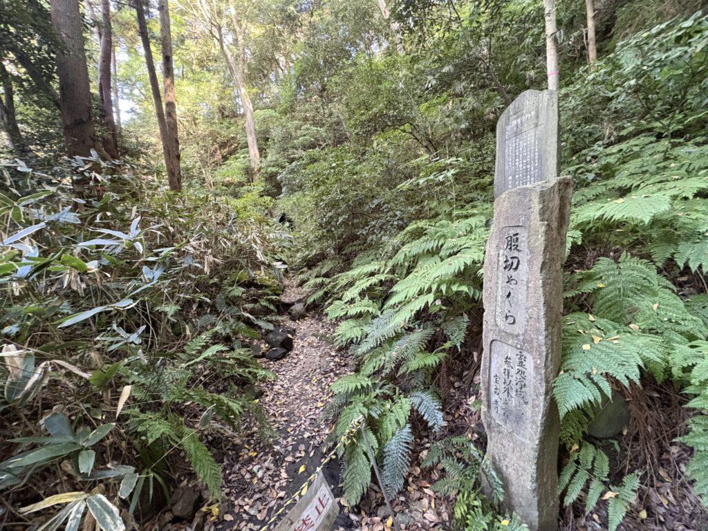 祇園山ハイキングコースの左手に腹切りやぐらがある。ハイキングコースの入り口に警告があるのはかなり怖い。