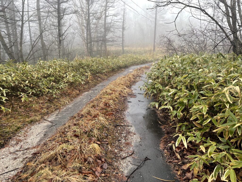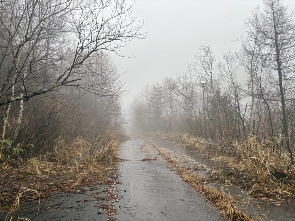 濃霧のせいで索道のワイヤーロープが見えないため、とりあえずロッジのゲレンデ側入口から続く道を歩いてみる。