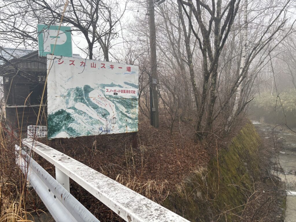 そしてシズカ山スキー場の看板を発見。近くには川が流れている。