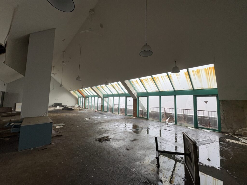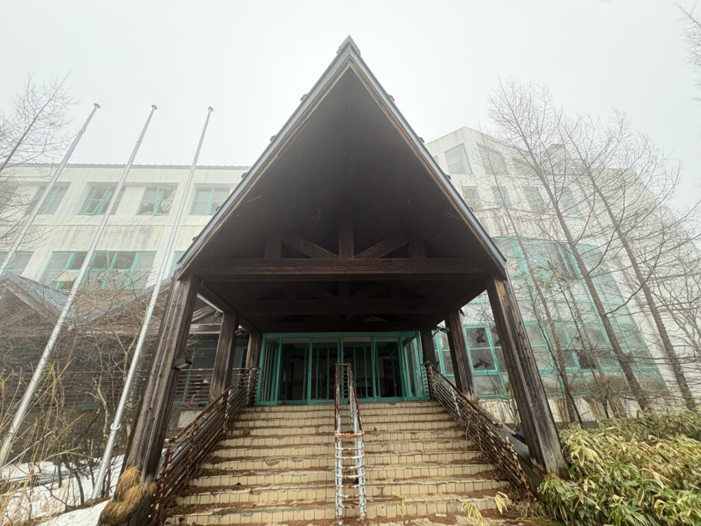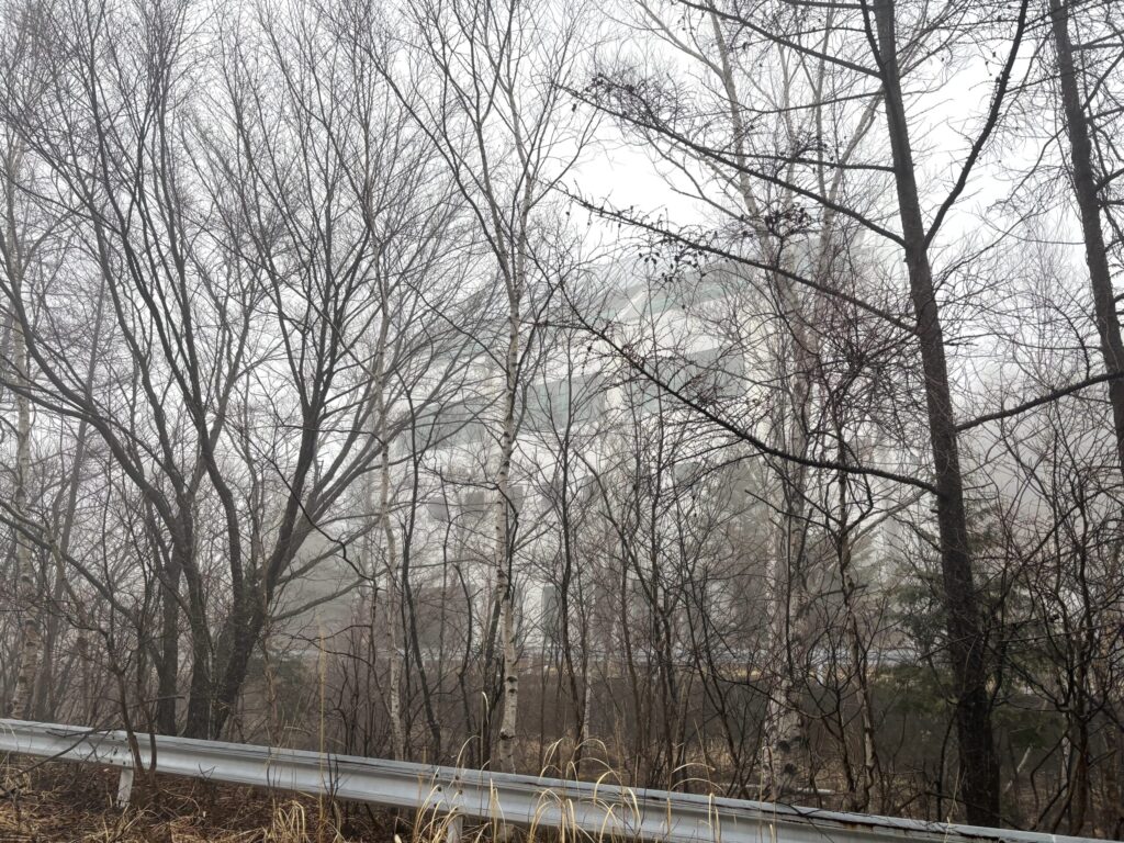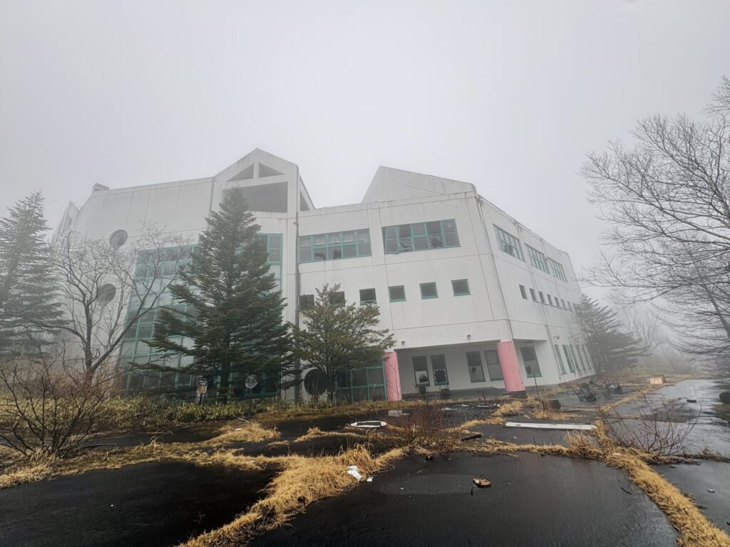 濃霧のせいで見ずらいがシズカ山スキー場のシンボルである大型ロッジを発見。