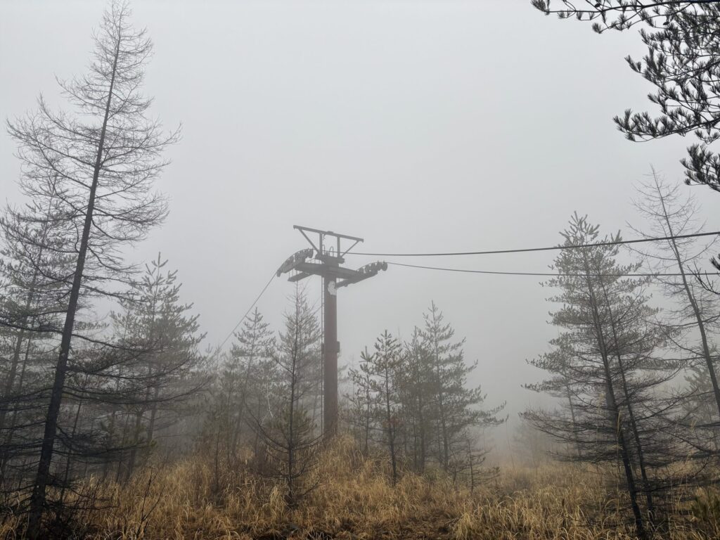 今日は小雨で、霧がかなり濃い。これではどこにリフトがあるか分からないかも(空にリフトが放置されているらしい)。